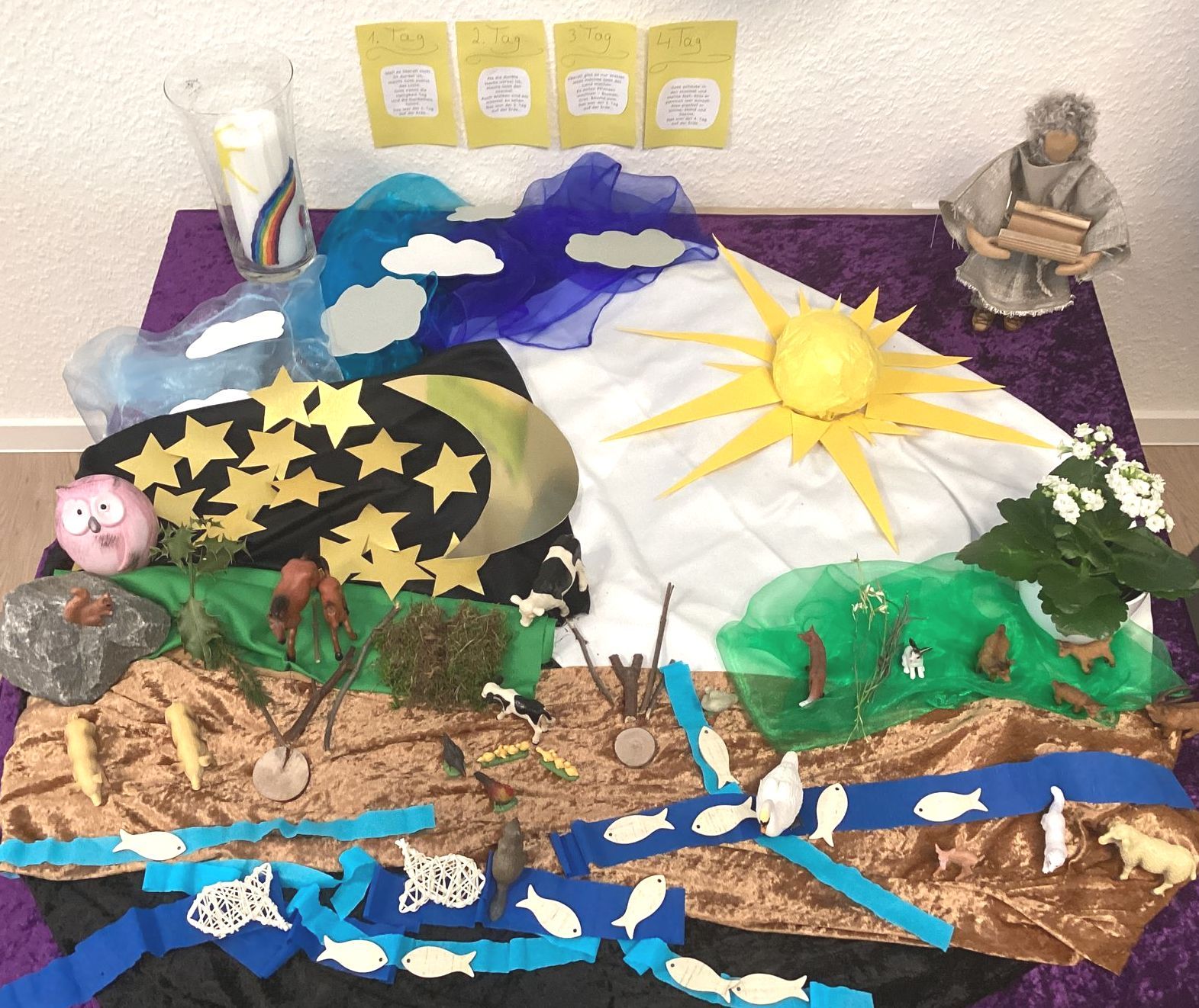 Außerdem war die Schöpfungsgeschichte ein großes Thema. In regelmäßigen Einheiten wurde den Kindern von der Entstehung der Erde aus der Bibel erzählt. Anhand eines großen, „wachsenden“ Bodenbildes konnten die Kinder genau erkennen, was Gott an den einzelnen Tagen erschaffen hat: Tag und Nacht, Wolken und Himmel, die vielen Pflanzen, Sonne, Mond und Sterne, die Tiere und Menschen! Natürlich kamen dabei auch die neuen biblischen Erzählfiguren zum Einsatz!